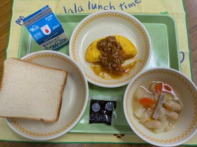 パン・ふじのみや産たまごのオムレツ・オムレツ用きのこソース・ポトフ・チョコクリーム・牛乳