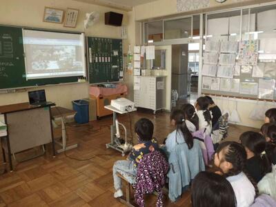 フェスタ北山での学びを山宮小学校の1年生に紹介しました。向こうの学校のフェスタについても教えてもらいました。