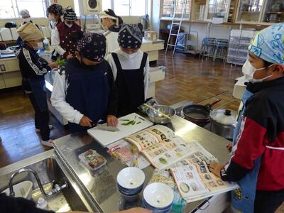 11/26(水)、家庭科の調理実習で、ごはん、みそ汁、おかずの計画を立て、グループごとにごはんプレートを作って食べました。5・6年生で学習した調理を振り返り、ごはんを炊いたり、みそ汁を出汁から取ったり、炒める調理をしておかずを作ったりしました。協力して取り組み、手際よく準備から片付けまでできました。