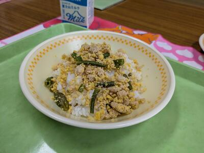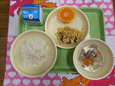 ごはん・とりとたまごのそぼろ・みや汁・きっかみかん・牛乳