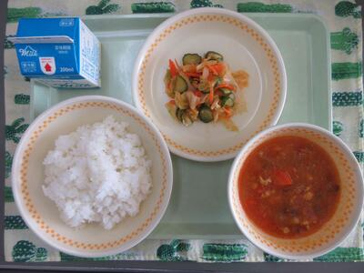 ごはん・いわしの梅煮・野菜のごまあえ・豆乳入りみそしる・牛乳